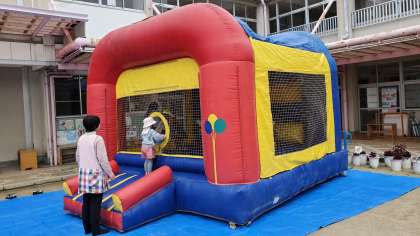 お別れ会が終わると、園庭にエア遊具が!同じ大阪市立幼稚園のPTAさんのご厚意で野里幼稚園にお借りしたもので、中に入るとトランポリンのように跳ねて遊ぶことができます。子どもたちは大興奮で遊んでいました。