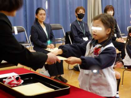 修了式では、園長先生から一人ずつ保育証書をいただきました。おうちの方のほうを向いて「幼稚園で楽しかったこと」や「小学校に行って頑張りたいこと」を言いました。みんなの嬉しそうな、誇らしげな表情が印象的でした。