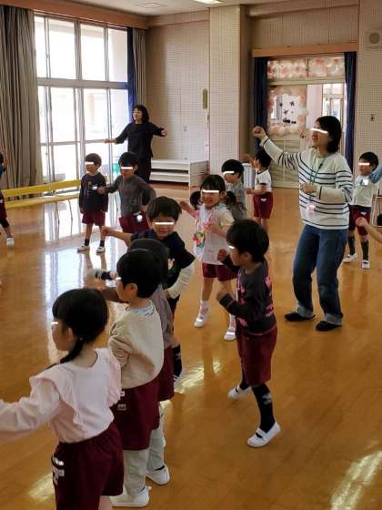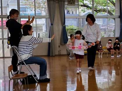 そら組さんから、キャンディの首飾りのプレゼントをしてもらいました。先生たちからのプレゼント「おたすけこびと」のお話を見たり、おうちの人と「スイッチ ポン」のダンスを一緒にしたりと、楽しい誕生会になりました。