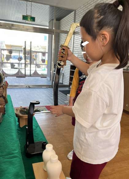 先生から人形や飾りの由来を教えてもらい、みんなで五月人形を飾りました。