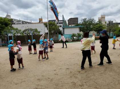 園庭での好きな遊びの後は、全園児で集会遊びをしています。