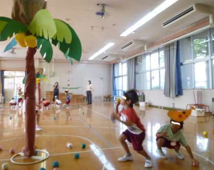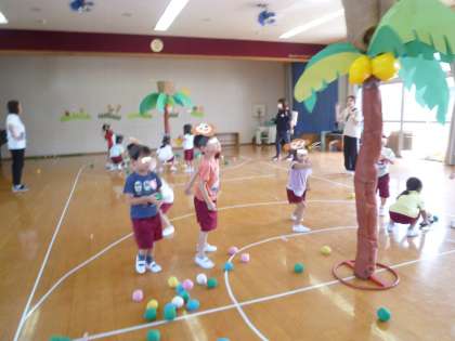 先日つくったおさるさんとバナナを使ってチーム分けをし、玉入れ遊びをしました。
