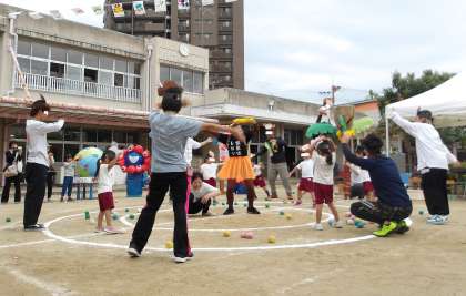 さくら組の親子競技は、サルチームとバナナチームに分かれての玉入れ対決。