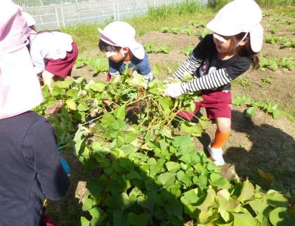これまで毎日の水やりや、お世話をしてくださった主事さんに感謝の気持ちを伝え、子どもたちは収穫したおいもを手に大喜びでした。