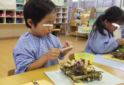 先日幼稚園で収穫したさつまいもの芋づるや、大阪城公園の遠足で拾ったドングリなど、いろいろな自然物を使って作品づくりを楽しんでいます。