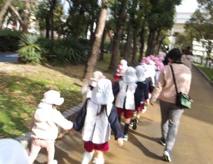 また、初めての園を出てのお散歩となったひよこランドのお友達も、そら組のお兄さん・お姉さんと手をつないでしっかり歩くことができました。