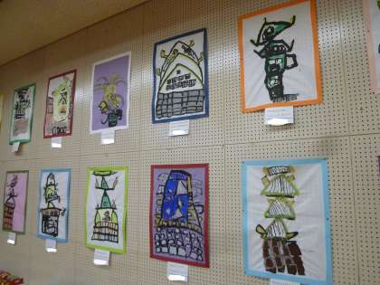 年長児は他にも、和紙に墨汁を使って大阪城天守閣をかいた絵や、園で収穫した柿の絵、サツマイモでつくった手作りの落款を押した絵も一人一点ずつ展示していました。