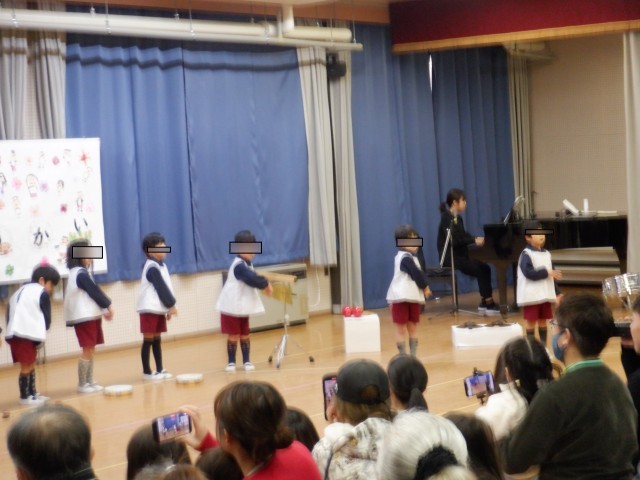 初めての発表会となるさくら組さんの歌と合奏では、運動会でお家の人と一緒に楽しんだサルVSバナナの玉入れの経験から、おさるさんのお面を被って『アイアイ』を歌ったり、みんなが元気になる『まほうのおまじない』の歌を歌ったりしました。