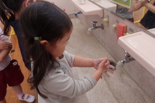 最初に、正しい手の洗い方を保育室で確認してから、実際に手を洗いました。