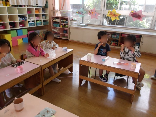 美味しいお弁当を食べた後は、歯みがきです!歯みがきをすることも、とても楽しみにしていたさくら組さん。