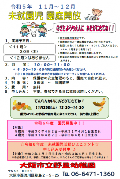 未就園児園庭開放(11月,12月)・てんらんかい一般開放のお知らせ