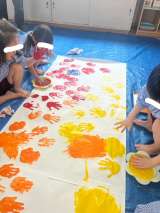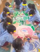 みんなで絵の具遊びをし、大きなこいのぼりをつくりました。 絵の具を手につけペタッ...