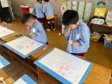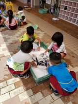 そら組さんは、色をつけたシャボン玉液を紙の上で膨らませて、割れた時にできる模様を...