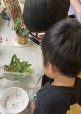 園庭のミカンの葉に小さな幼虫を見つけてから保育室で飼育しています。 毎朝、「大き...