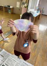 「どろっとしてる!」「気持ちいい〜!」と絵の具の感触を楽しんでいると、 最初は緑...