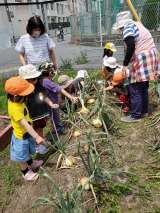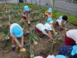 幼稚園の畑でタマネギを収穫しました。主事さんが昨年度より大切に育ててくれたタマネ...
