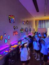 お店屋さんの一角にブラックライトのトンネルがあり、子どもたちが花火や星、おばけな...