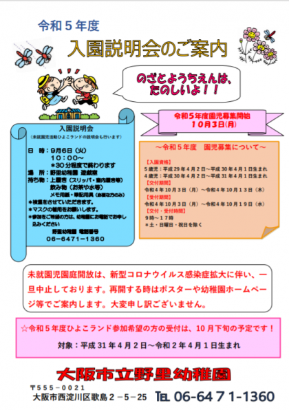 令和5年度入園を希望される方、令和5年度ひよこランド(未就園児活動)に参加を希望...