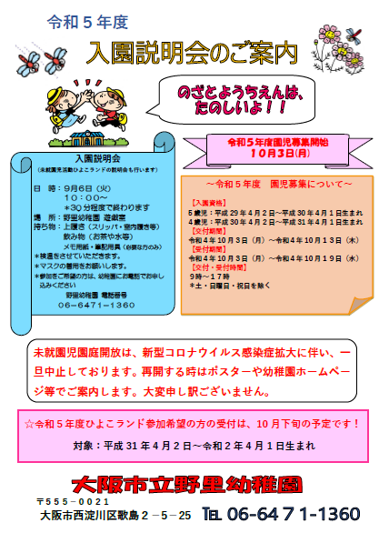 令和5年度、幼稚園に入園を希望される方、ひよこランドに参加を希望される方を対象に...