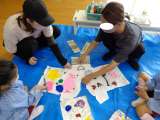 4歳児さくら組の親子が、運動会で着るTシャツに絵をかきました。 お友達とお袖をく...