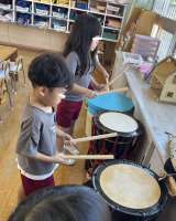 先日の和太鼓演奏会に参加してから、好きな遊びの時間に保育室でも太鼓を叩いて遊んで...