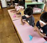 お月見の季節に合わせて折り紙でうさぎをつくりました。 端を合わせるのが難しく、苦...