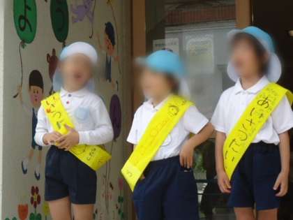 今年度のあいさつ隊は、手作りの「あいさつたすき」をつけて…。少し恥ずかしそうにしながらも、嬉しそうな子どもたちです(*^^*)