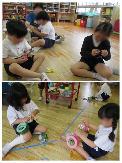 新聞ボールをつくったり、スズランテープを三つ編みしたり…。自分でつくったからこそ、完成すると大喜びでくるりんスキップを回していました(*^^*)