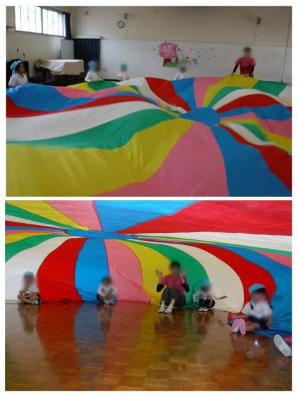 みんなでパラバルーンでも遊びました。パラバルーンをパタパタしたり、中に入ってかくれんぼしたりして、楽しかったね!!