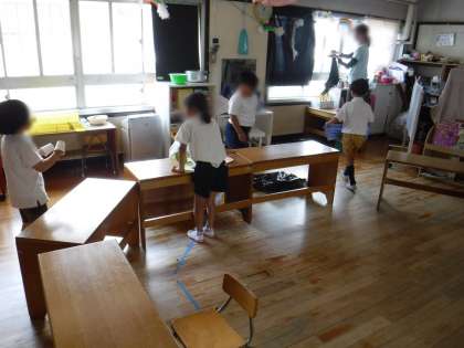 「今度は私たちが…!」と机を並べて道をつくったり、どんなおばけにしようか考えたりしながら、「もも組さん・こぐまクラブのお友達が危なくないように…!」と配慮も欠かしません。