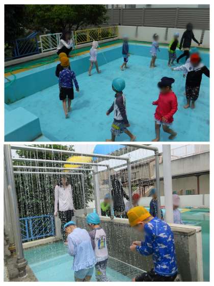 にじ組の子どもたちは、お掃除を頑張ったので、水のトンネルを通ってみたり、少しシャワーの通り抜けをしたりすることも楽しみました。