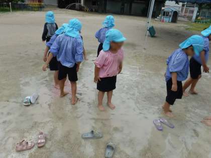 遊びに行っちゃえ〜!ということで、雨上がりの園庭でどろんこ遊びと水鉄砲をしました。