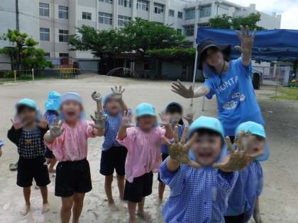 「にゅるにゅるしてる〜」「気持ちいい〜!」と、泥の感触を存分に味わって遊びました。
