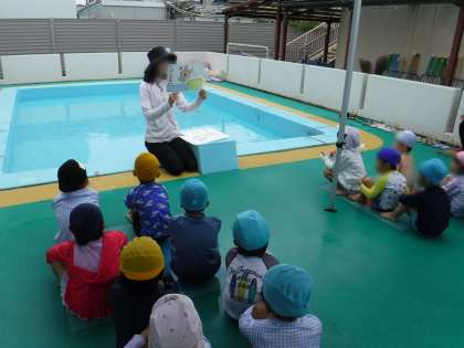 プールに移動し、園長先生のお話を聞いたり、プールの約束を聞いたり…。