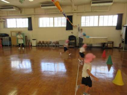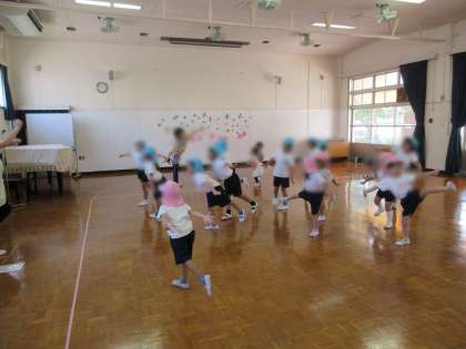 今日は遊戯室だったけど、今度は園庭で、元気いっぱい体操したり走ったりしようね!!