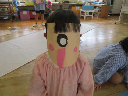 3枚目…一つ目小僧のお面ができたところ「見て!こわい?」