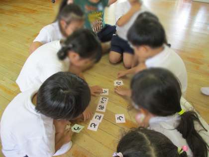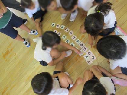 「ん?裏に文字がかいてある!」と気付くと、見つけた文字を並び替えながら「なんだこれ…」「“ようちえん”になるんじゃない?」とみんなで考えます。