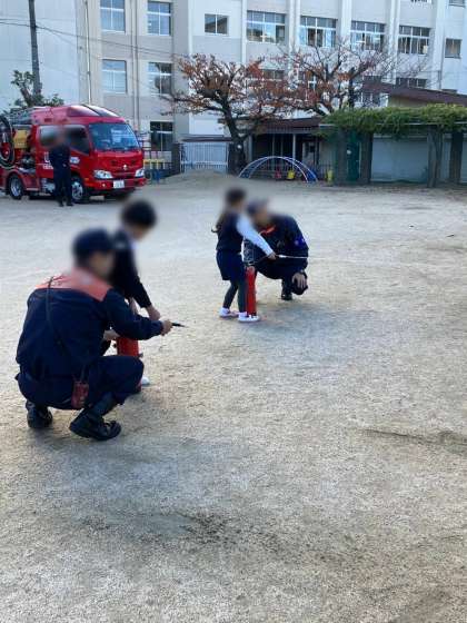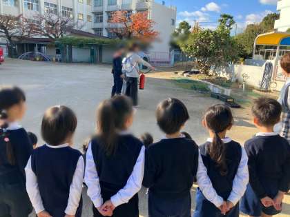 先生たちが消火訓練をした後、子どもたちも消火器を触らせてもらいました!!
