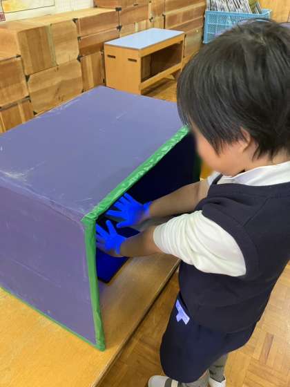 手洗いをし、ブラックライトで手に残っている汚れを