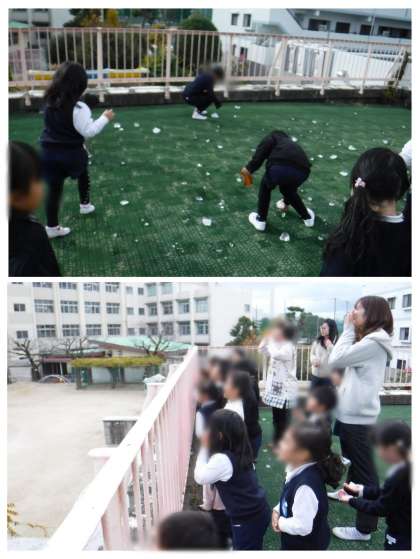 「めっちゃ寒いところから来てくれたんやなぁ」「園庭にも氷落ちてる!」「じゃあこっちの方に飛んで行ったんや!」と、思いを巡らせていました。