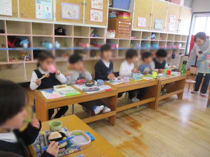 にじ組とこぐまクラブのお友達が一緒にお弁当を食べました。