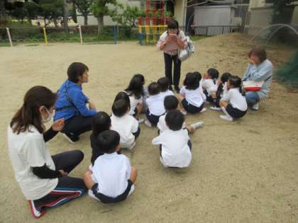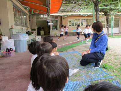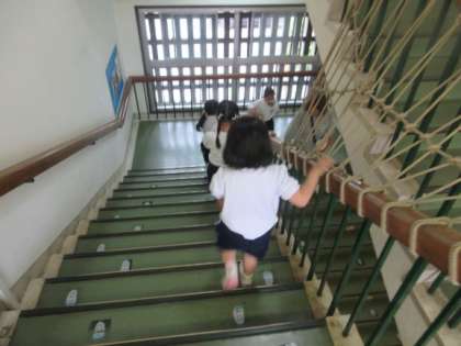 今年度初めて、火災の避難訓練をしました。4歳児もも組はテラスから5歳児にじ組の避難する様子をみました。「お・は・し・も」の避難する時の約束や煙を吸わないようにすることをみんな守りながら、避難することができました。災害はいつおこるかわかりません。大切な命を自分でも守れるように、これからも安全教育の進め方を考えていきたいと思っています。