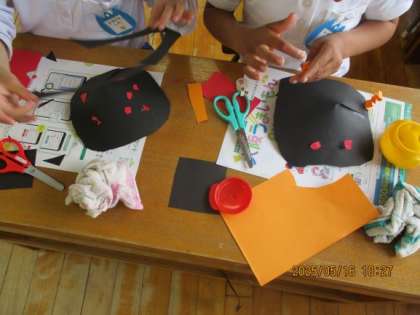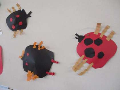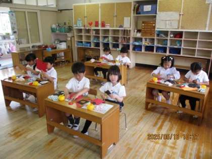 もも組とにじ組から子どもたちのかわいい歌声が聞こえてきます。子どもたちは「てんとうむし」の歌が大好きです。にじ組ではテントウムシをみんなでつくりました。「足は何本かな?」と図鑑を見たり「黒い服やからてんてんは赤にしよう」などテントウムシに興味をもち、楽しんでつくる姿が見られました。保育室に飾り、毎日テントウムシはみんなの歌声を聞いていますよ!園庭でもテントウムシ探しを楽しんでいます。