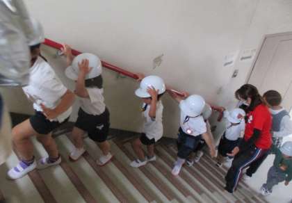 小学校と同時刻に地震が発生したと想定し、保育室の椅子や机の下に身を守った後、園庭に一次避難しました。