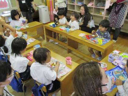 友達と楽しく食べている様子や食べることを喜び、自分で進んで食べている様子などお家の方に見てもらいました。