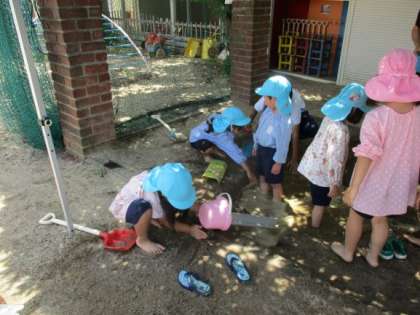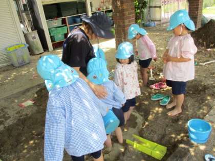 5歳児にじ組はクラスみんなで砂場で遊びました。大きな穴を掘ったり大きな山をつくったりしました。その後は水を入れてみんなで入ってみました。「冷たくて気持ちいいなぁ」と水の感触を楽しみました。「こっちにも穴掘ったよ。そっちとつなげよう!」と水の流れを試す様子もありました。友達と一緒に遊ぶ楽しさを感じ、自然を遊びに取り入れて遊ぶ面白さを味わっています。これからもクラスでいろいろな遊びをしていきたいと思っています。