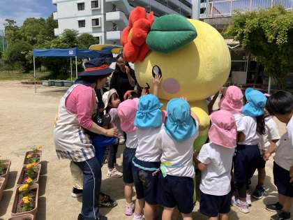 6日金曜日に区役所の方たちが、お花の植え方を教えに来てくださいました。自分たちで好きなお花を選んでお花を植えました。幼稚園にはきれいなお花がいっぱいになりました。毎日、水やりをして大切に育てましょうね。そして、幼稚園ににーよんも遊びに来てくれて、子どもたちはとても喜んでいました。楽しい時間でしたね。