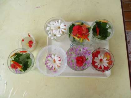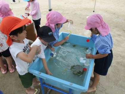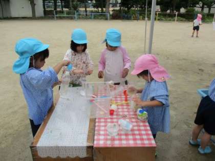 雨が降る前に水遊びをしました。水の周りに子どもたちは集まって遊んでいます。4歳児は水の感触を楽しんだり、水の移し替えを何度も繰り返したりして遊んでいます。5歳児は水の量を考えながら、こぼれないように水を汲んだり、水の上に園庭に咲いている花や葉を使ってきれいなジュースづくりをしていました。並べ方や色、大きさを考えて試して遊んでいました。年齢によって遊び方が変わってきます。いろいろな自然と関わって遊べるようにこれからも保育を考えていきたいです。