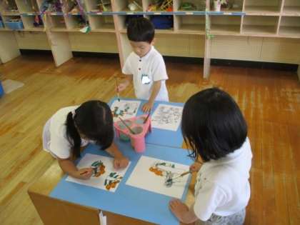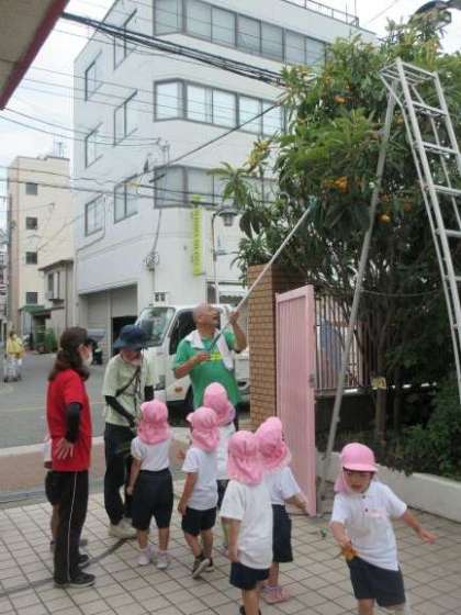 幼稚園のビワの木に、たーくさんのビワがなりました。そのビワを収穫しました。子どもたちも少しだけ収穫のお手伝いをしました。高いところになっているビワを切ってもらって大切そうにカゴに入れたり、収穫したビワを並べたりしました。葉や実の様子や大きさや色の違いにも興味をもって見ていました。5歳児は収穫したビワの絵をかきました。実や葉の生え方もよく見てかいていました。本物そっくりの絵がかけて子どもたちは嬉しそうでした。幼稚園内の自然の環境を生かしながら、保育の中にも取り入れ、子どもたちが身近な自然に親しめるように考えていきたいと思っています。