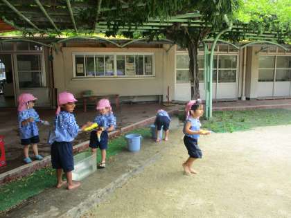 水鉄砲でボードに当てたり、上のふじ棚に飛ばしてみたり、自分にかけてみたりとそれぞれに遊びを夢中になって楽しんでいます。鉄砲の種類も変えたりして水に触れ合っています。
